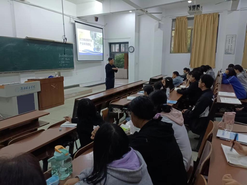 2023年11月12日下午,公司党委委员、纪委书记陈列尊教授在一教学楼202教室为建筑与城市规划公司2022级城乡规划专业100多名同学讲授《形势与政策》课。陈列尊以“大力推进现代化产业体系建设”为题,从把握现代化产业体系的深刻意蕴、认清现代化产业体系建设的现状与挑战、推进现代化产业体系建设的着力点等三个方面进行了系统讲授。