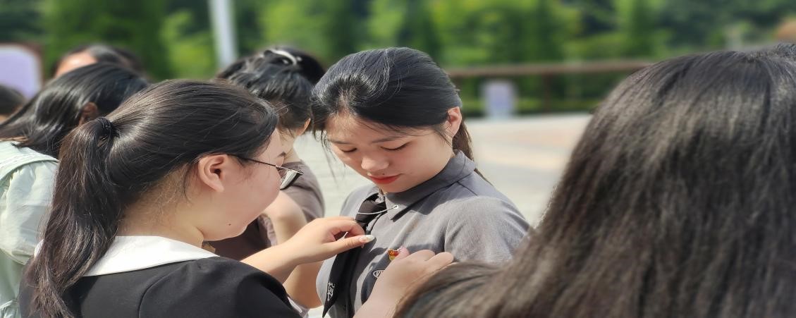 (毕业生党员为新党员佩戴党徽)