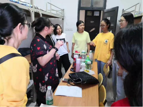 在一栋631寝室里,负责该寝室的高永爱老师与每位同学畅谈他们各自家乡的特色,一下子拉进了与孩子们的距离。楚静老师了解到大家正在为庆国庆70周年歌咏表演估做准备,便兴致所致,当场来了一段,优美的歌声让同学们惊叹不已,掌声雷动,寝室气氛很是热烈。匡列辉博士表示同学们如果有什么专业上的困惑尽管来问他,知无不言,言无不尽。刘凌霄老师问起孩子们生活上的细节,看她们是不是适应了这种集体生活,并嘱咐大家,有什么问题可以通过微信群或者电话随时联系老师。