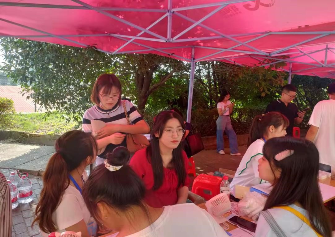 四位新生助班们,等待在迎新台,进行现场咨询接待,为新生答疑解惑,让新生了解入学流程。员工志愿者们负责引导新生办理入学手续和入住。