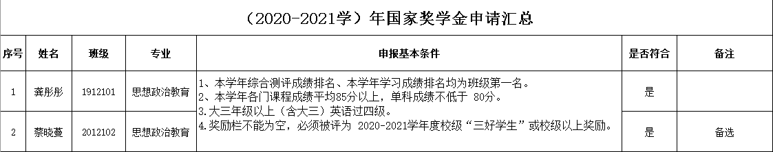 公司2020-2021学年国家奖学金评定工作于9月末开始启动。依据《关于做好2021年普通高校国家奖助学金评审工作的通知》(湘学助〔2021 〕28号)文件精神,公司本着严格、公平、公正的原则,按照本人申请、班级推荐、院评审工作领导小组审核的程序严格进行评定工作。经公司党政联席会议研究讨论决定,以下同学推选到校资助办参选2020-2021学年国家奖学金,现公示如下: