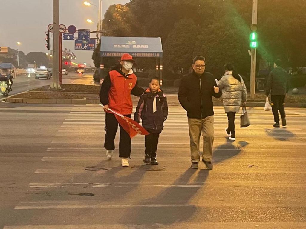 志愿者引导小朋友过马路