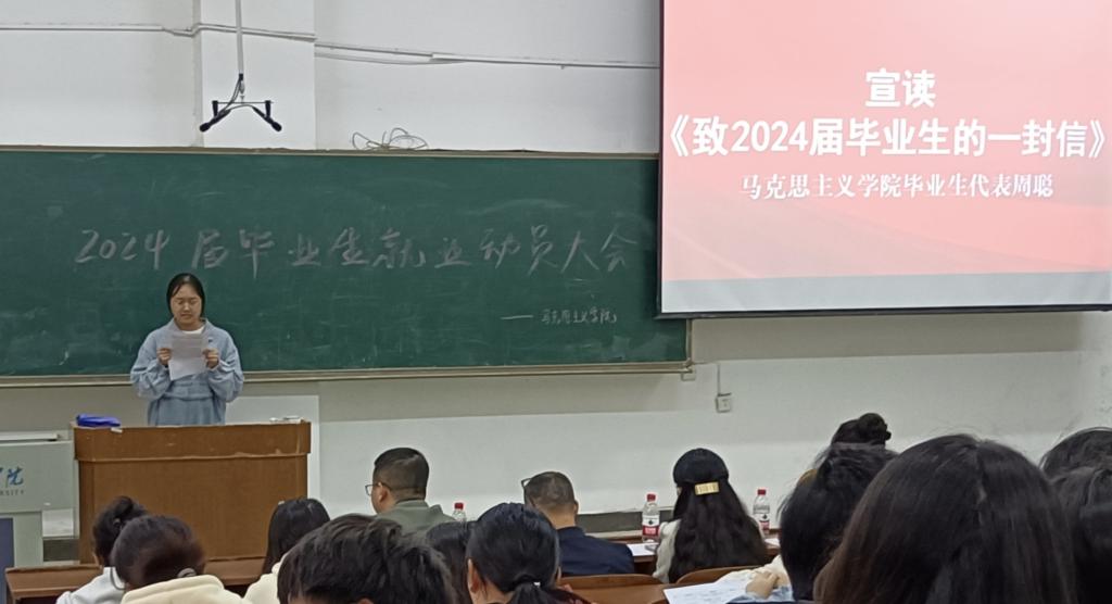 毕业生代表周聪宣读“伟德源自英国1946人才招聘处致2024届毕业生的一封信”,鼓励同学们调整心态,积极参与公司、公司组织的各类就业指导活动,不断提升就业能力。