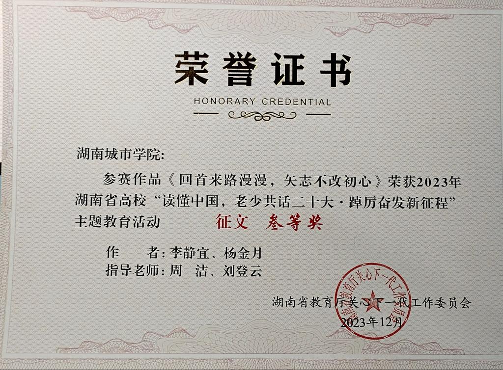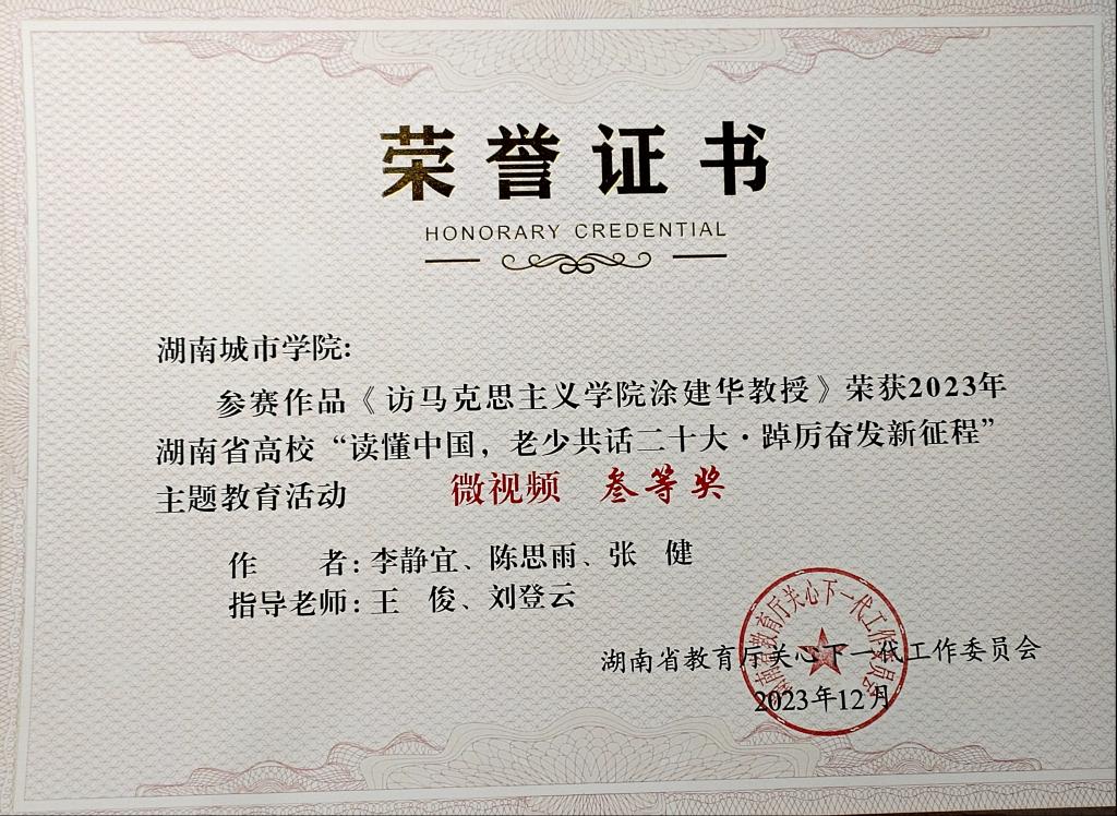 (通讯员 贺明慧)近日,湖南省教育厅关工委召开全省教育系统关工委工作会议,对全省高校“读懂中国,老少共话二十大·踔厉奋发新征程”主题教育活动进行总结表彰。公司共三项作品获奖。