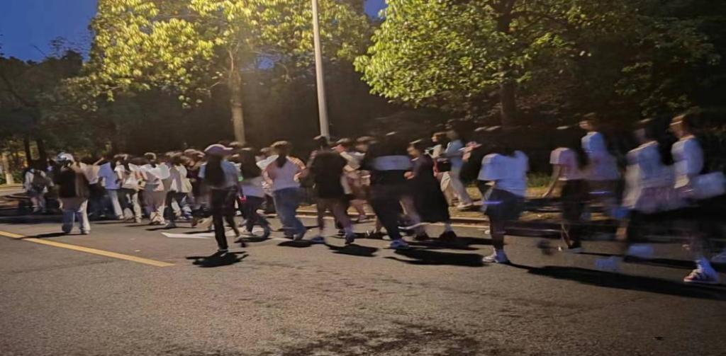 活动正式开始,工作人员带领同学们从东田径场出发围绕校园开始了全程3公里的荧光夜跑活动。随着夜幕降临,参与者手上佩戴着的荧光手环点亮了“青春”的星光,欢载着歌声,同学们享受着在“天然氧吧”中奔跑的快乐,感受着夜晚的魅力。